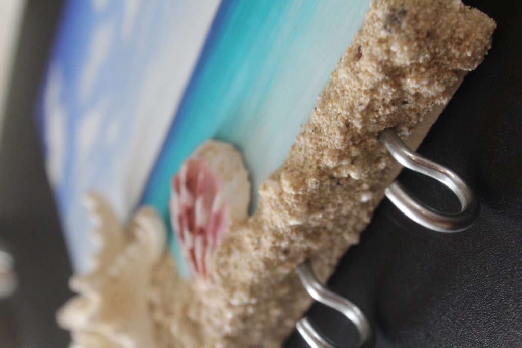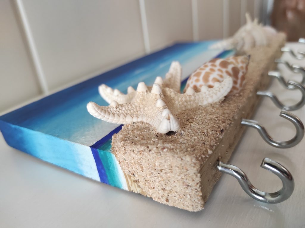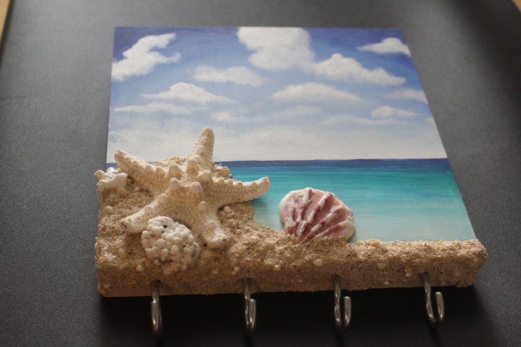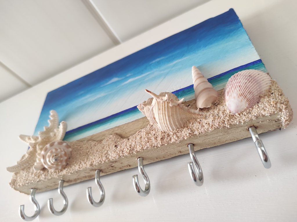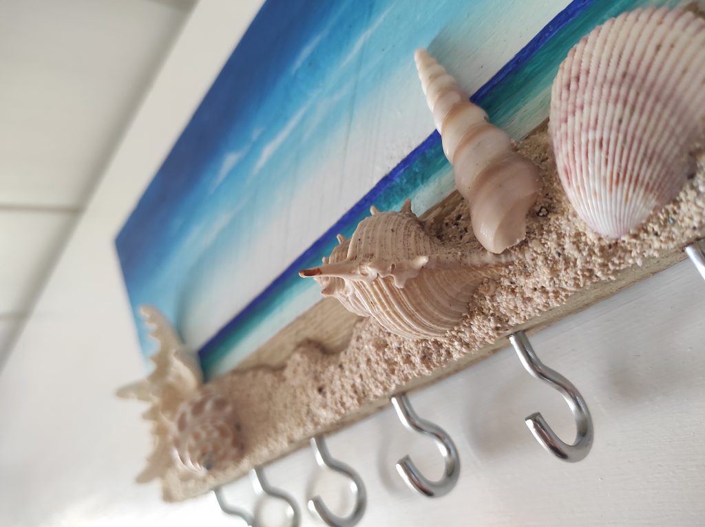 Llavero de pared con materiales reciclados y naturales, madera, piedras ,arena y conchas.